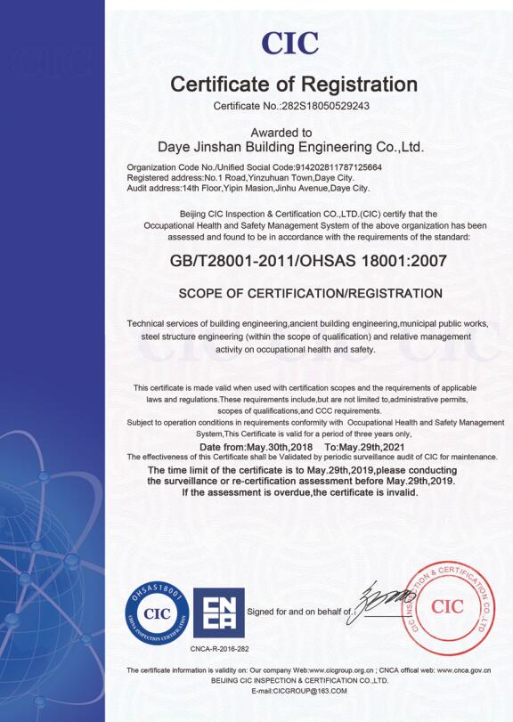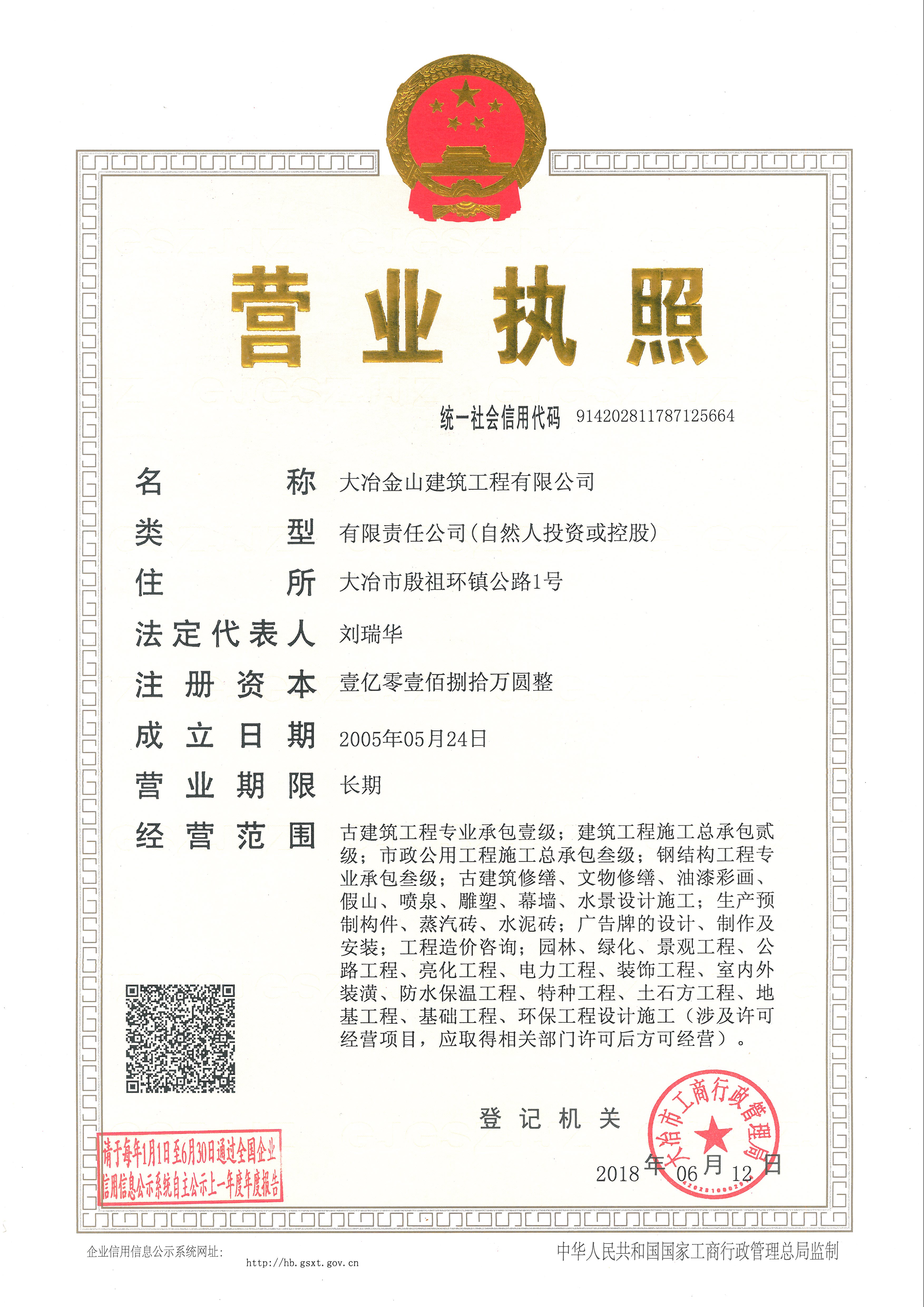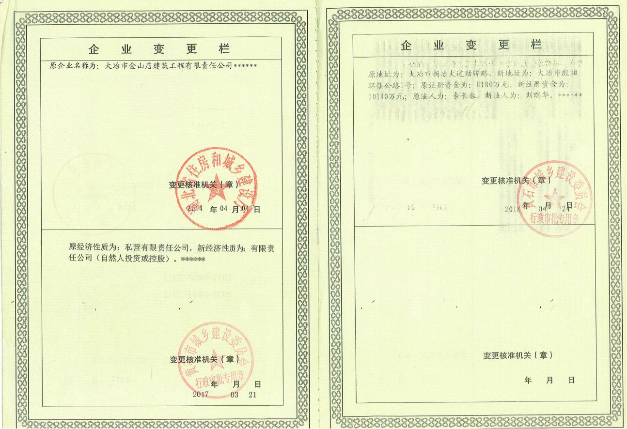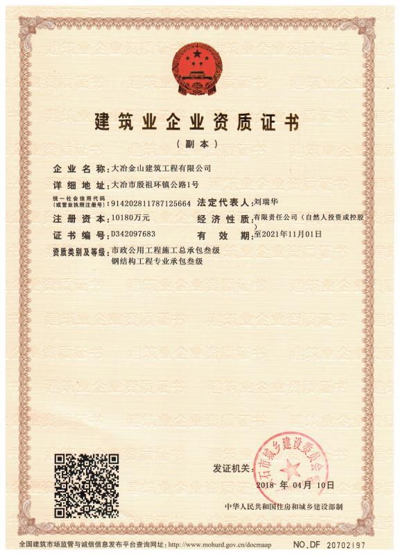 大冶金山建筑工程有限公司始建于1984年,屬鎮(zhèn)辦集體企業(yè)。1997年改制為大冶山建筑工程有限責任公司,屬股份制企業(yè)。2013年更名為大冶金山建筑工程有限公司,2018年3月公司資源重組,公司注冊資金達到10180.00萬元,公司法定代表人為劉瑞華。公司具有古建筑工程專業(yè)承包壹級、建筑工程施工總承包貳級、市政工程總承包叁級、鋼結構工程專業(yè)承包叁級資質(zhì)。
