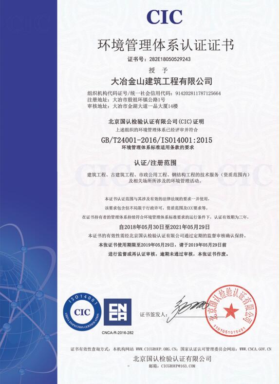 環(huán)境管理體系認證證書...